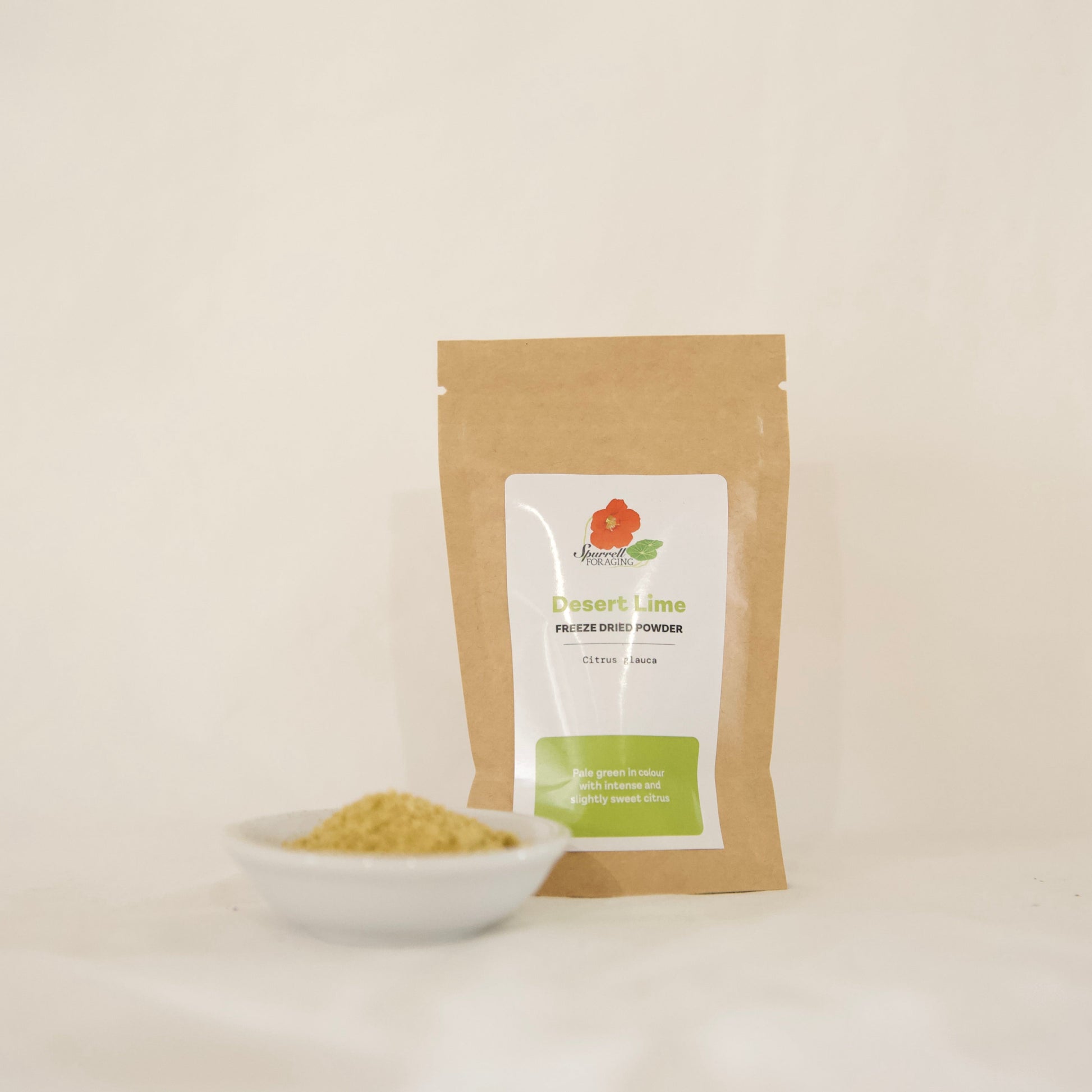 25g - Freeze dried desert lime powder is a pale green in colour with intense and slightly sweet citrus