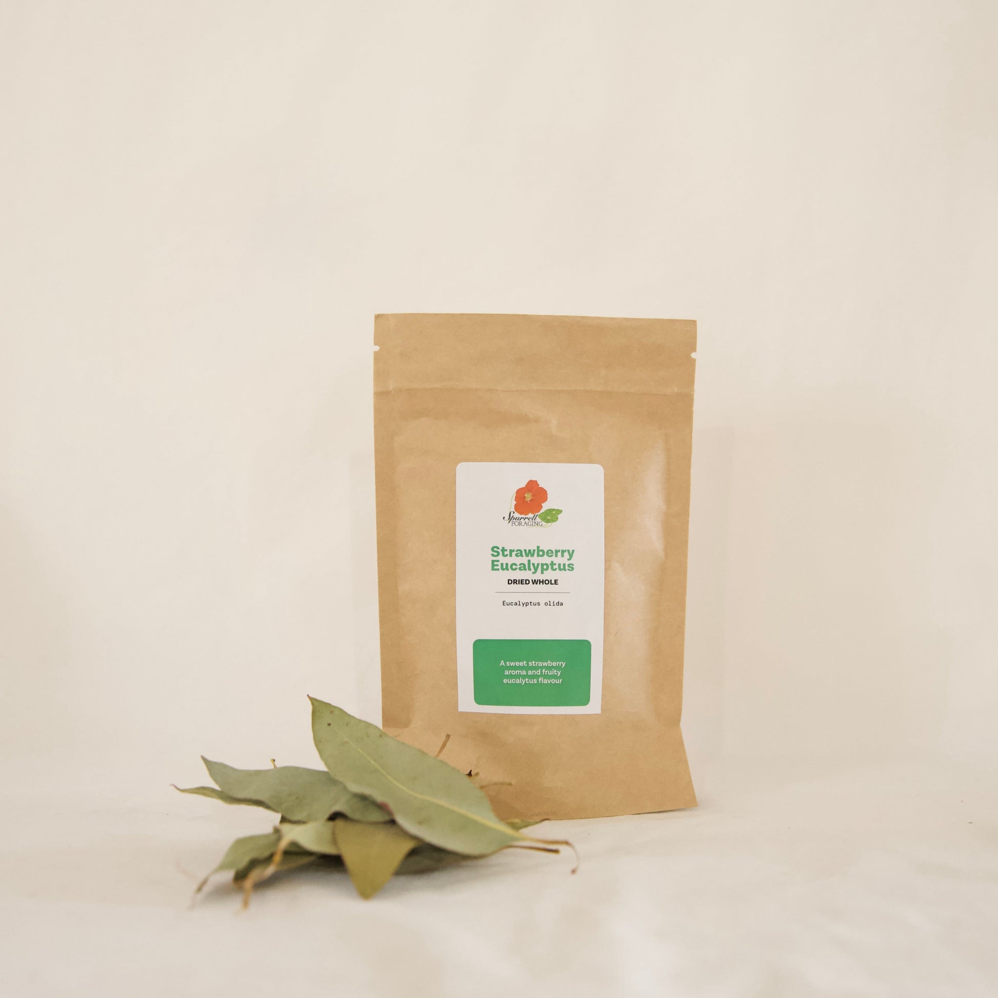 50g - Whole dried strawberry eucalyptus leaves hold a sweet strawberry aroma and fruity eucalyptus flavour